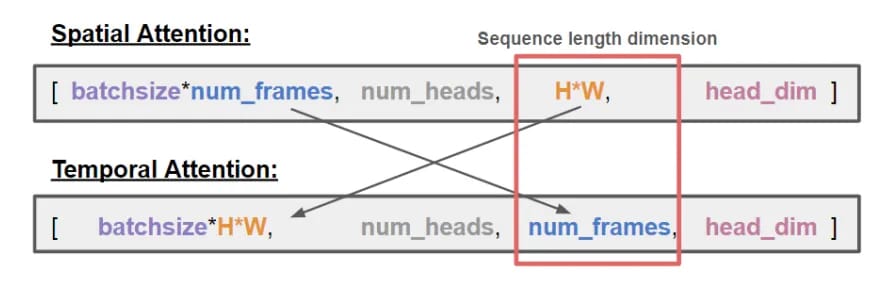 “Tensor dimensions are rearranged to perform Spatial versus Temporal Attention. As shown, sequence length is proportional to image size in Spatial Attention and number of frames in Temporal Attention.”