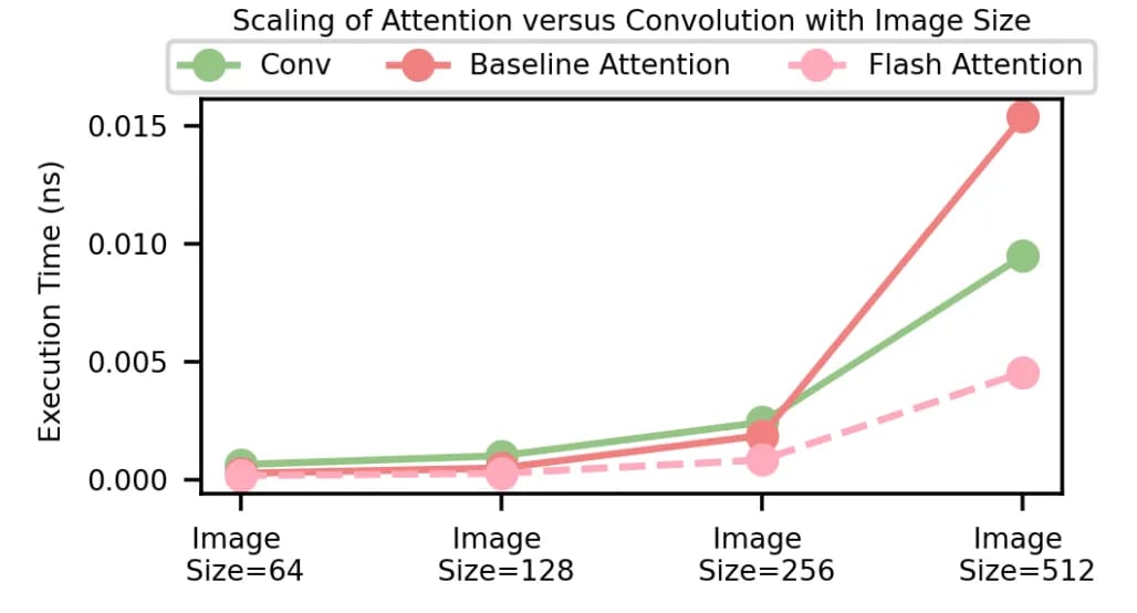 The authors also found that after techniques such as Flash Attention are applied, Convolution actually has a larger scaling dependence with image size than Attention. That is, after applying Flash Attention, Convolution execution time scales at a faster rate than Attention execution time with increasing sequence length/image size.