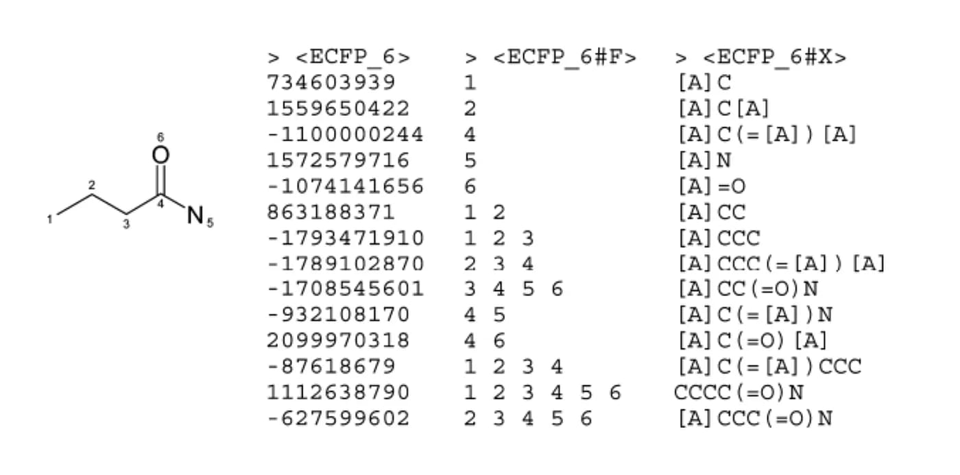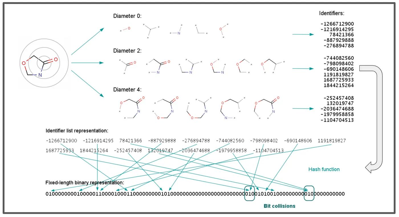 Extended-connectivity fingerprints (ECFPs) are a type of molecular fingerprint specifically designed for predicting and analyzing molecular activity and properties. First introduced in 2000, they have since been widely adopted across various fields. (Interestingly, they are conceptually similar to convolutional operations: like the convolution operator in CNNs that apply the same function in all directions before global pooling, ECFPs use iterative circular hashing to capture local chemical environments before proceeding to a global pooling step.)