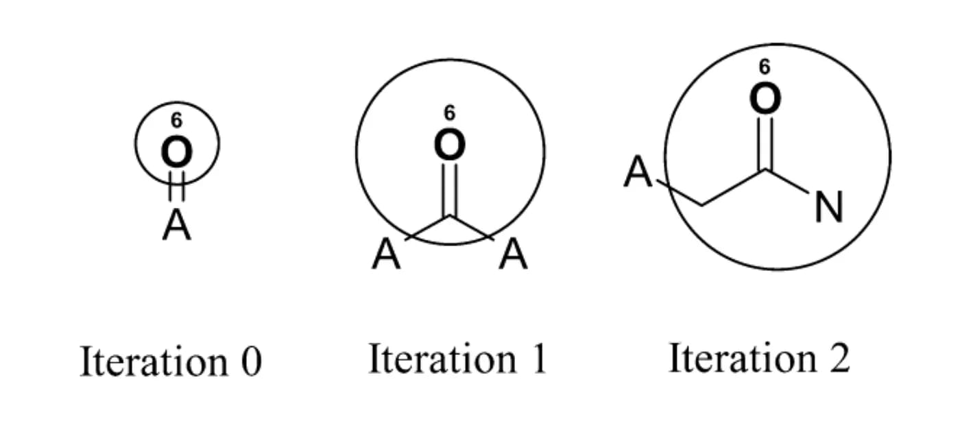 At the beginning of the process, the initial identifier only represents information about the atom itself and its attached bonds (the “A” atom type represents an arbitrary attachment atom). After one iteration, the identifier now contains information about immediate neighbors. After two iterations, the identifier contains information for a larger substructure (including the amide group plus the aromatic ring).
