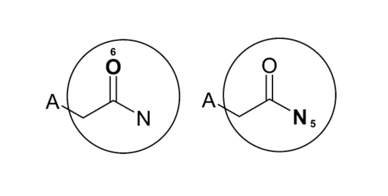 “The feature regions after two iterations centered on the oxygen (left) and the nitrogen (right). Since both of these regions contain exactly the same atoms and bonds, they represent duplicate information, even though their hashed identifier values are different.”